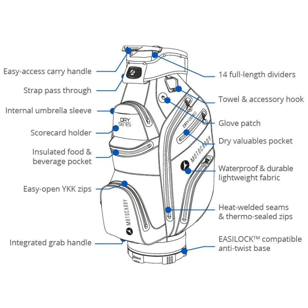 The Motocaddy Dry Series Cart bag is fully waterproof and is Motocaddy’s most technical bag in the range. The new Dry-Series bag is manufactured from a durable ‘rip-stop’ Nylon fabric incorporating cutting-edge waterproof technology. It combines heat-welded seams with thermo-sealed zips to ensure its contents remain dry, even in the most challenging weather conditions. Brand new styling and market-leading Japanese YKK zips, the bag also features plenty of club space with 14 full-length dividers.